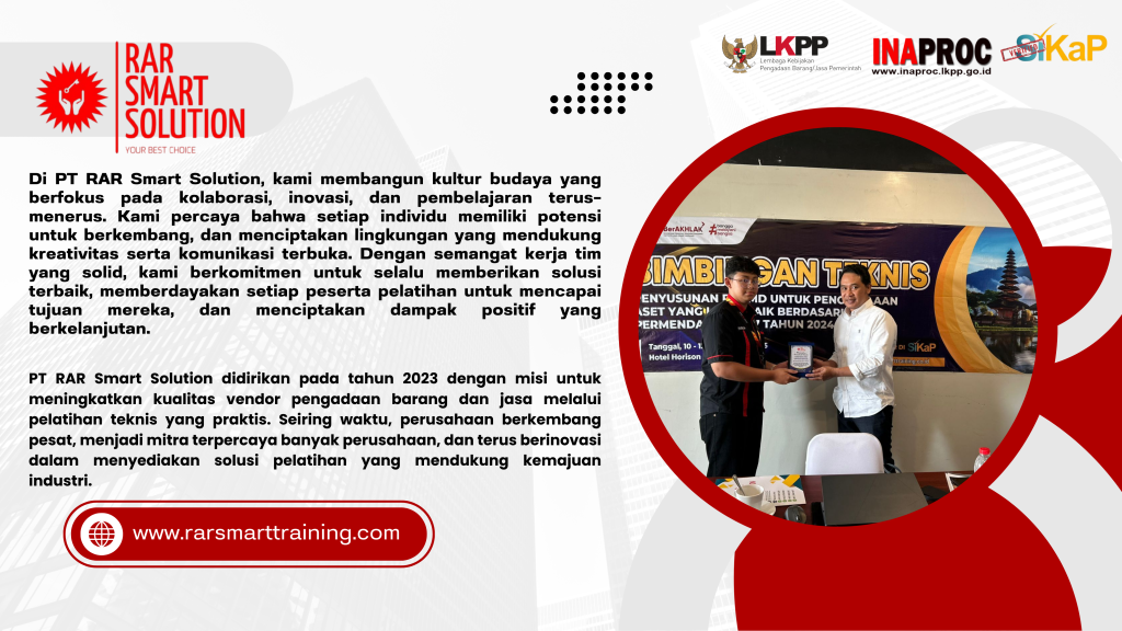 PT RAR Smart Solution didirikan pada tahun 2023 dengan misi untuk meningkatkan kualitas vendor pengadaan barang dan jasa melalui pelatihan teknis yang praktis. Seiring waktu, perusahaan berkembang pesat, menjadi mitra terpercaya banyak perusahaan, dan terus berinovasi dalam menyediakan solusi pelatihan yang mendukung kemajuan industri.